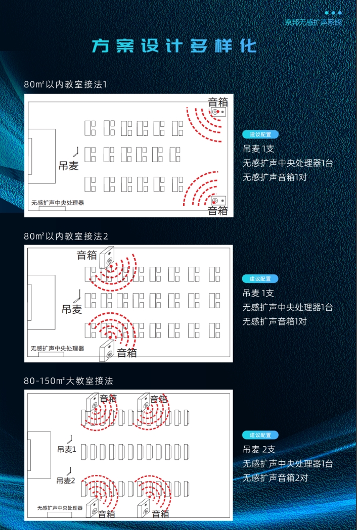 采用無(wú)接觸拾音設(shè)備,更安全舒適,讓老師在教室中不再被束縛,解放雙手,自由行走在教室中,活動(dòng)范圍無(wú)限制,無(wú)需繁瑣的調(diào)試準(zhǔn)備,授課過(guò)程輕松暢談,讓聲音傳播到教室內(nèi)的每個(gè)角落,可以更加專注于授課內(nèi)容